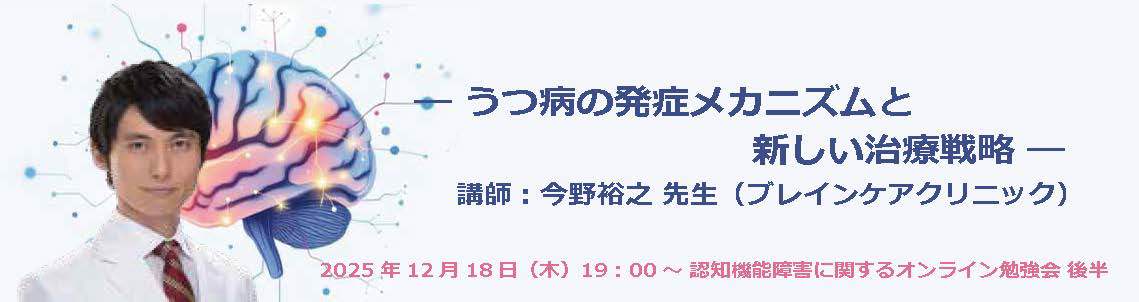 このたび、ブレインケアクリニック名誉院長 今野裕之医師 主催「第4回 認知機能障害オンライン勉強会」を、12月18日(水)19:00より開催いたしますので、ご案内申し上げます。