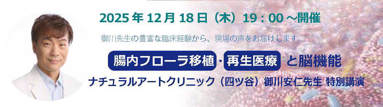 今回の勉強会では、ナチュラルアートクリニック(四ツ谷)院長 御川安仁先生 をお迎えし、腸と脳、そしてメンタルヘルスを結ぶ最新トピックスについてご講演いただきます。